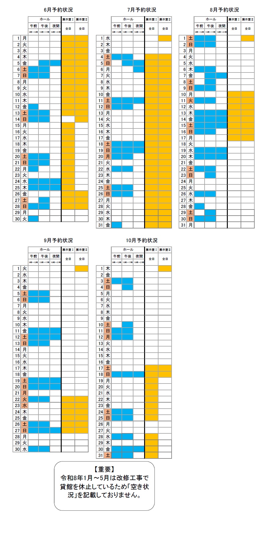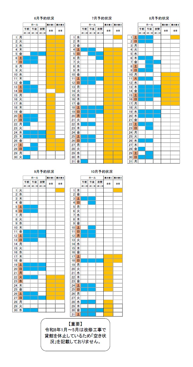 ※利用される日の6か月前の属する月の初日から、申し込み順に受け付けます。仮予約は2日から電話予約可能です。